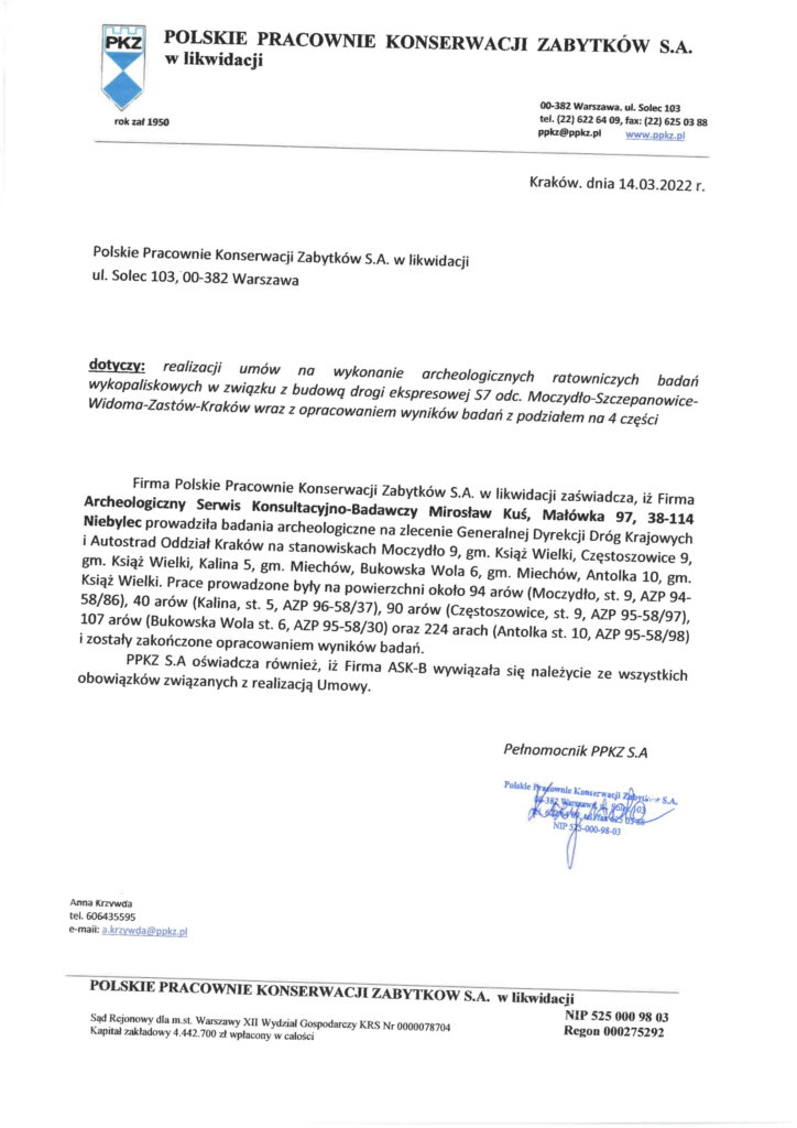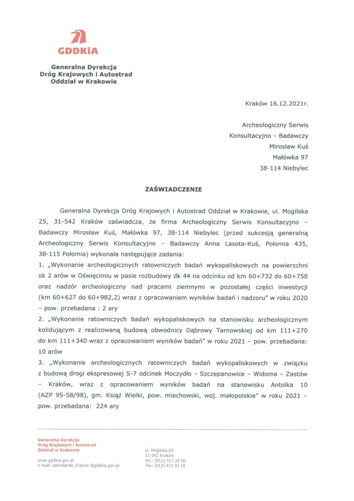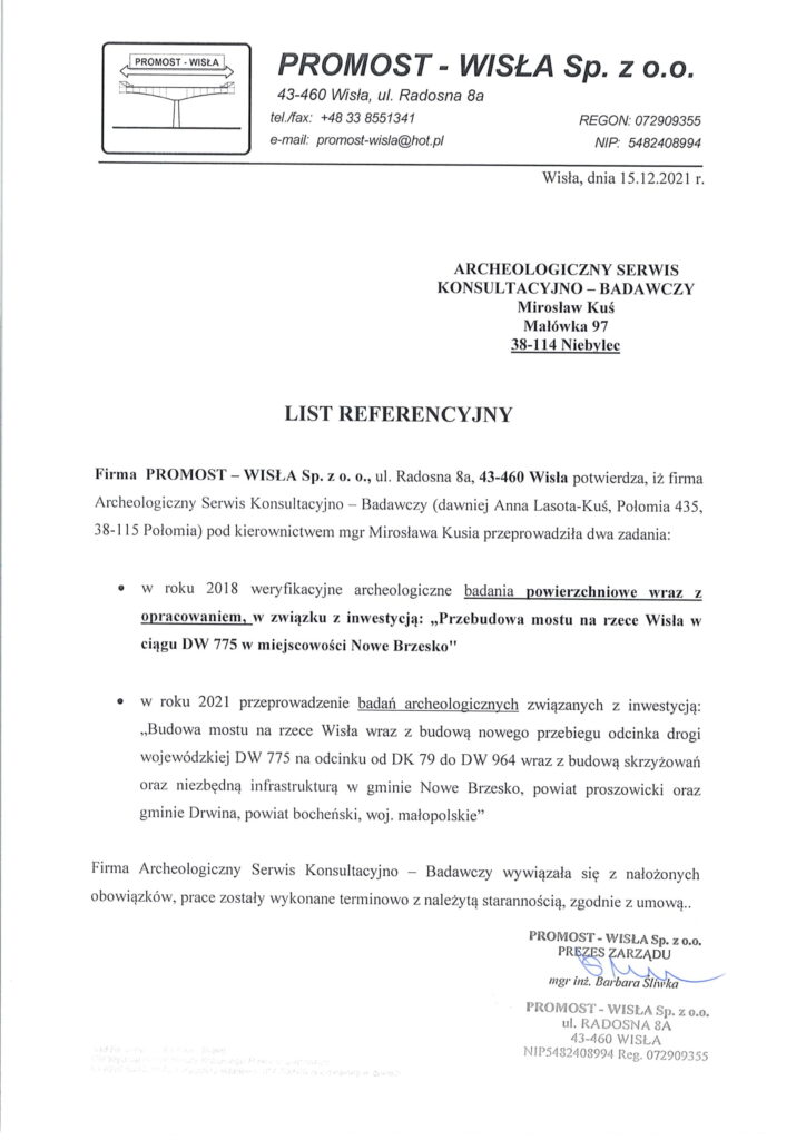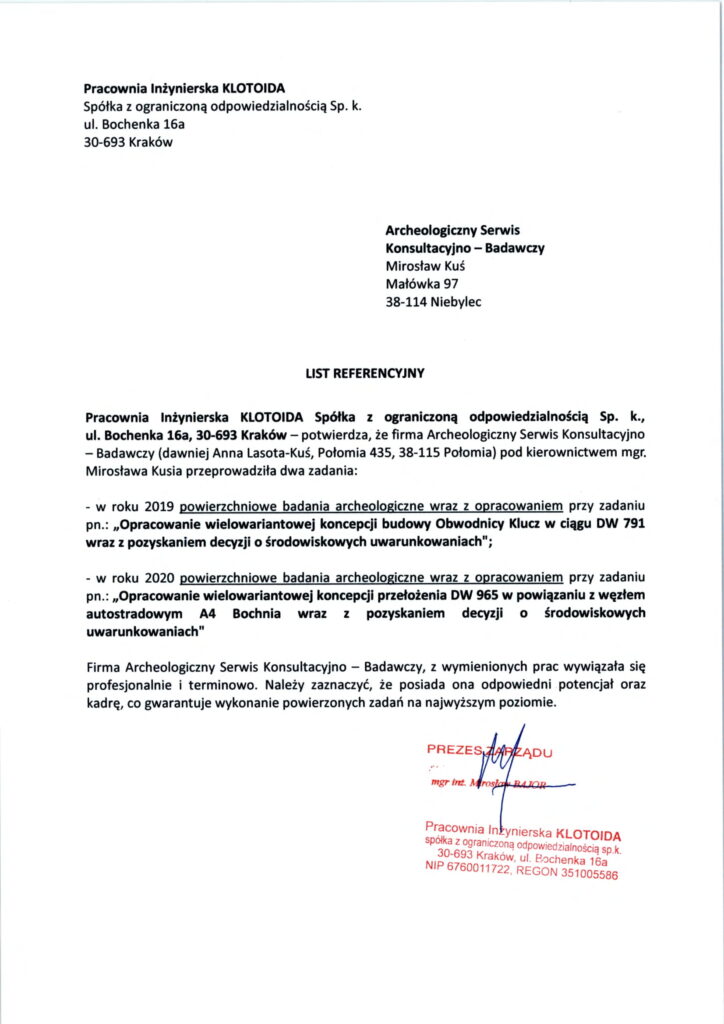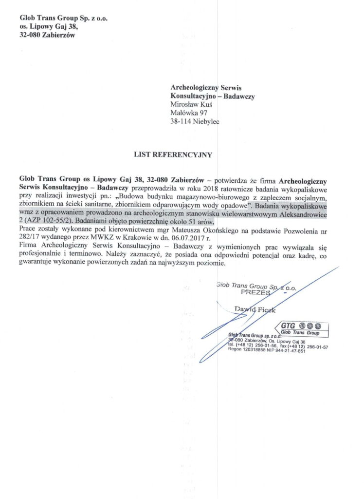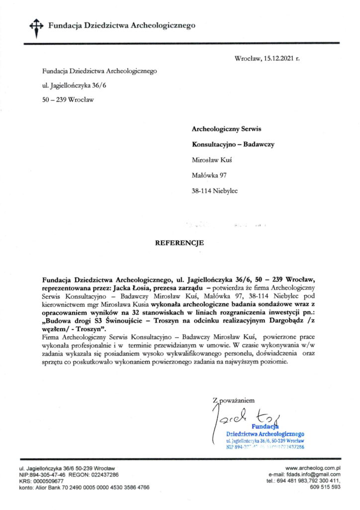 Firma Archeologiczny Serwis Konsultacyjno - Badawczy Mirosław Kuś, powierzone prace wykonała profesjonalnie i w terminie przewidzianym w umowie. W czasie wykonywania w/w zadania wykazała się posiadaniem wysoko wykwalifikowanego personelu, doświadczenia oraz sprzętu co poskutkowało wykonaniem powierzonego zadania na najwyższym poziomie.